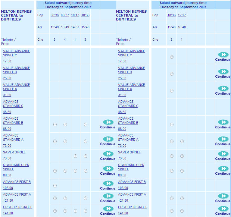 In fact, it gets to the stage now where I’m becoming suspicious that the baffling arrangements aren’t actually designed to confuse customers and reap the benefits of their lack of patience or lack of knowledge to find the right deals. There is no sense of service here, only pandering to government requirements for companies to create offers for the underprivileged. Take the various varieties of student travel card, and Britain isn’t alone on this account. Or click on the image and take a look at how asking for an earlier train on thetrainline.co.uk can result in a previously unavailable ticket magically appearing. Indeed, the manner in which such offers seem to disappear and reappear lends one to conclude that such websites are designed to hide offers from those who might actually take advantage of them. This screenshot even begs another question, that being of how the Value Advance tickets are still available whilst the Advance Standard C ((Slightly cheaper than the Banana and Toffee Mix I mentioned earlier.)) appears to have sold out - would some customers voluntarily pay almost thrice the price of the cheapest ticket for exactly the same service?