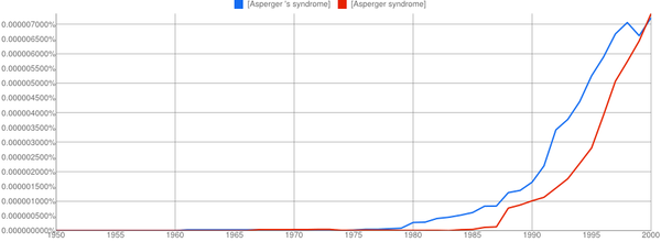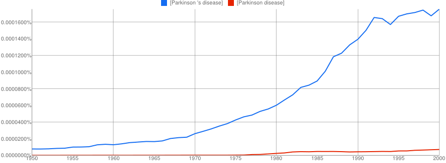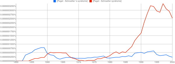 The other conclusion you might draw is that if two names are involved, the apostrophe is quickly dropped if it is used at all. It’s only a small sample, but Paget-Schroeter’s disease seems to have been the favoured term only for a short initial period, whilst Creutzfeldt-Jakob’s disease doesn’t even get a look in with the apostrophe.