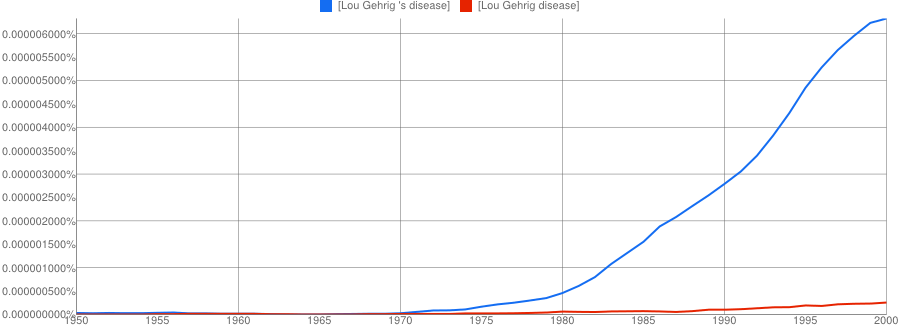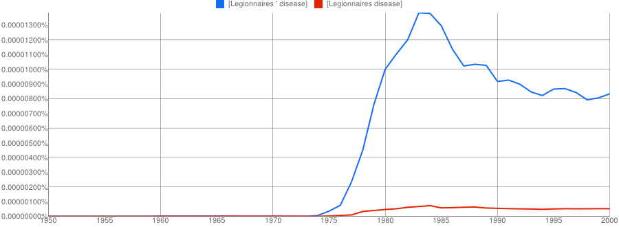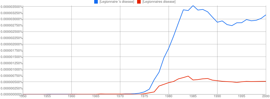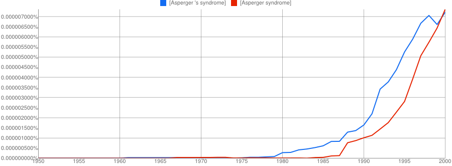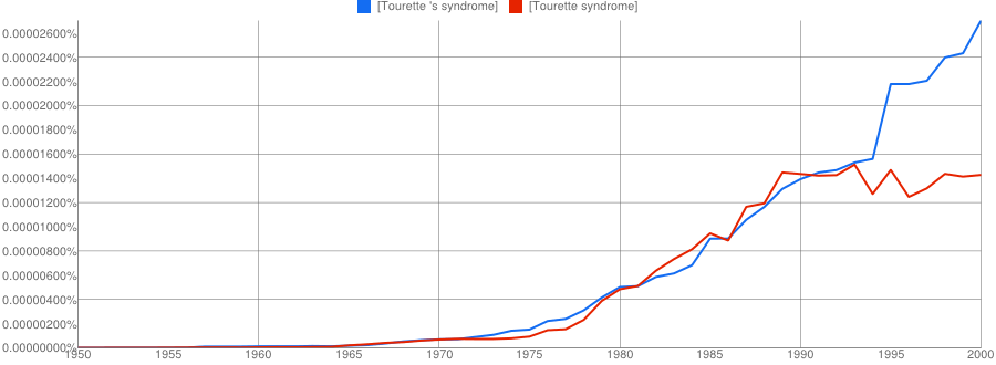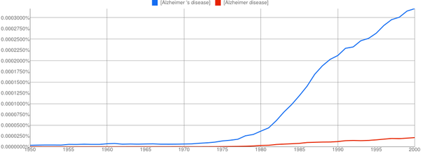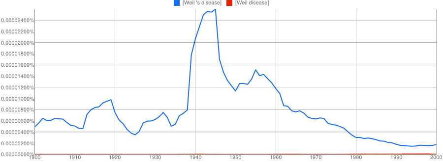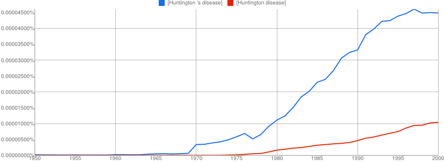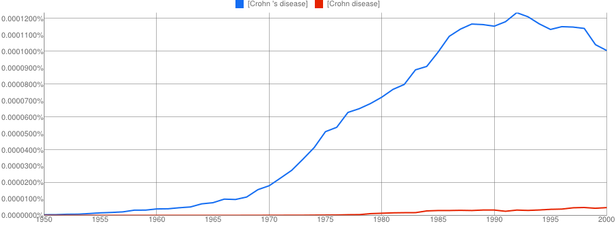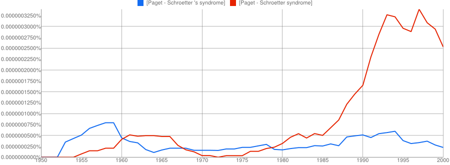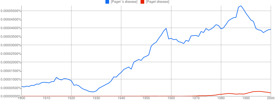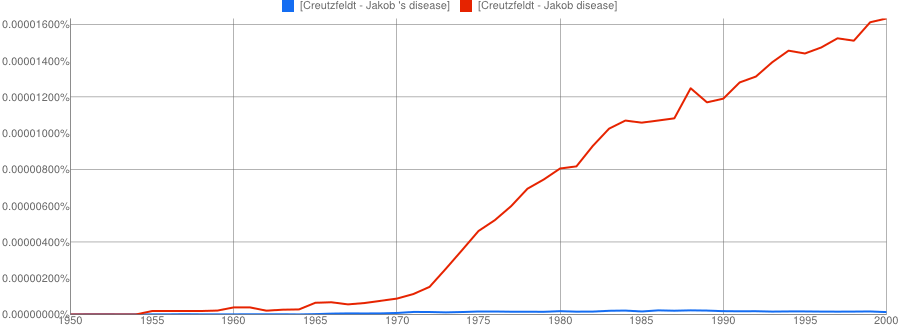 The other conclusion you might draw is that if two names are involved, the apostrophe is quickly dropped if it is used at all. It’s only a small sample, but Paget-Schroeter’s disease seems to have been the favoured term only for a short initial period, whilst Creutzfeldt-Jakob’s disease doesn’t even get a look in with the apostrophe.